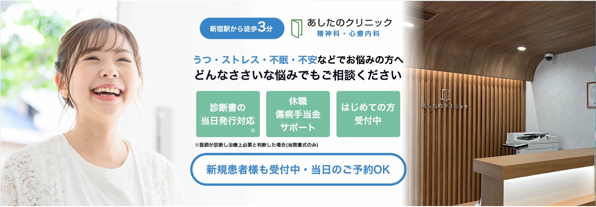 そのような場合には、睡眠外来のあるキュレアクリニックや、あしたのクリニック新宿院の受診がおすすめです。